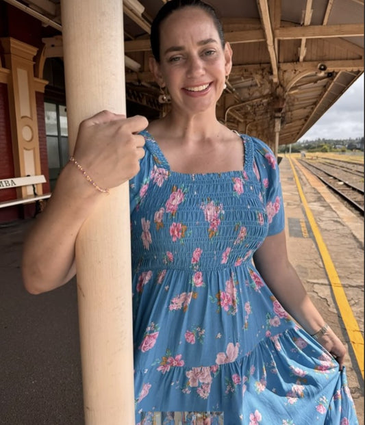 Sold outBlue shirring floral dress