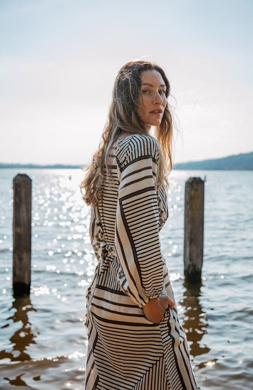 The Floaty Linen Cotton Dress in the large square print is crafted from a breathable blend of 55% linen and 45% cotton. With a relaxed fit, raglan sleeves, elastic cuffs, self belt, side seam pockets and a straight hemline, it features an exclusive print inspired by the paddocks and fence lines of Goondiwindi.
